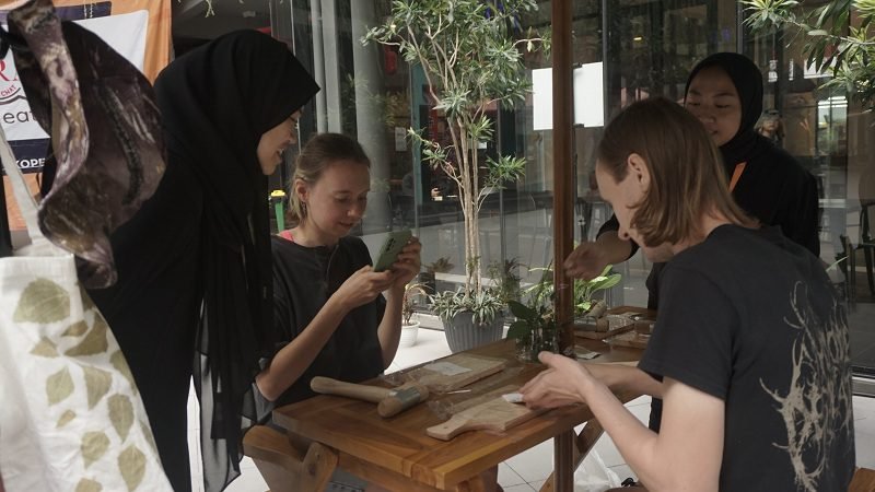 SIARINDOMEDIA.COM – Sepasang turis Rusia terhenti dari langkah mereka dan menyoroti produk ecoprint milik brand fesyen berkelanjutan asal Kota Malang, Reramban. Motif dan corak daun yang unik itu, memikat perhatian mereka. Sepasang suami istri asal Rusia itu telah tinggal selama beberapa bulan di Indonesia lalu menetap di Kota Malang. Tepatnya mereka merupakan penghuni Begawan Apartment yang merupakan lokasi digelarnya program Ramu Reramban.
