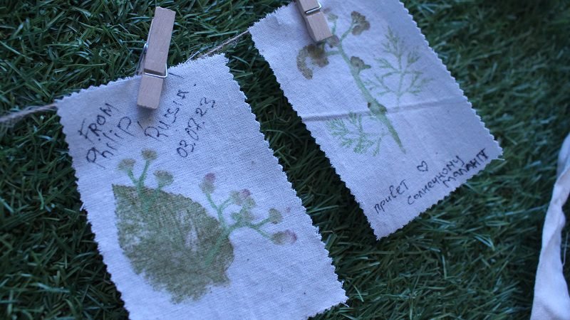 Philip dan Julia pun turut serta mempraktekkan teknik hapazome, salah satu teknik pembuatan ecoprint, di atas lembaran kain blacu yang telah direndam dengan air tawas selama satu malam.