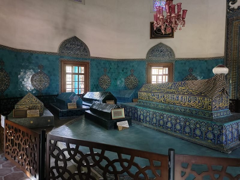 Pintu masuk ditutup dengan lemari besi berbentuk “setengah kanopi”. Saya coba meraba setiap ukiran di dinding pintu masuk, sungguh teringat bagaimana Haci Awad Pasha merancangnya. Pintu mausoleum dihiasi dengan ubin Iznik dengan pola bunga biru, putih, dan kuning. Pintunya terbuat dari kayu dan diukir dengan presisi dan seni. Di dalam makam ada mihrab, sepertinya ini digunakan bagi yang ingin berdoa kepada Allah saat ziarah makam, sehingga kuburan berada di belakang jamaah.