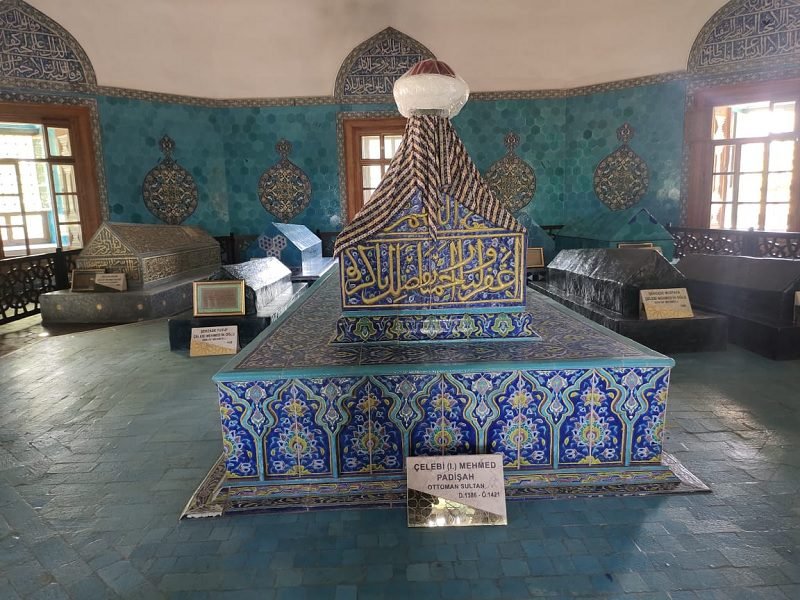 Makam Sultan Mehmed I di dalam Mausoleum Hijau tertulis di atasnya dalam khat Tsulust dengan dekorasi ubin keramik Cina warna biru, hijau dan kuning, lengkap dengan tahun wafatnya.