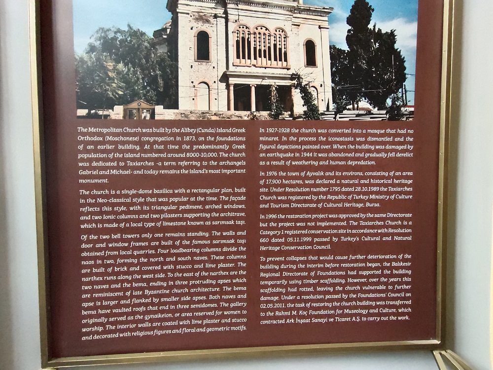 Dalam papan informasi yang menempel di Museum Taksiyarhis, bahwa tempat ini adalah sebuah gereja yang dibangun oleh komunitas Ortodoks Yunani (Moschonese) di Pulau Alibey (Cunda) pada tahun 1873, dulunya adalah Gereja Anakent (Metropol).