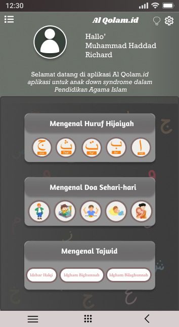 “Setelah mengisi data diri, pengguna akan langsung masuk ke dalam aplikasi Alqolam. id. Pada rancangan aplikasi ini terdapat pembelajaran huruf hijaiyah, pengenalan doa sehari-hari dan pengenalan tajwid,” ungkapnya.