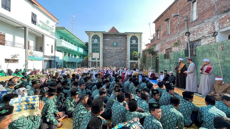SIARINDOMEDIA.COM – Madrasah Tsanawiyah (MTs) Hasyim Asy’ari Kota Batu menghadirkan Imam Masjid Azhar Kairo Mesir, Syeikh Asyraf Hamid Hasanain pada Jumat (6/9/2023). Kegiatan ini dirangkai dengan senandung sholawat dan doa bersama di lapangan madrasah bersama ratusan siswa.