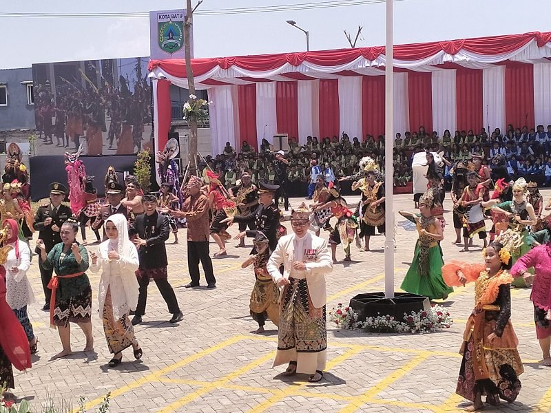 Selanjutnya, upacara diawali dengan pembacaan teks Pancasila, UUD 1945 dan pembacaan sejarah singkat Kota Batu oleh Kepala Bagian Administrasi Pembangunan Setda Kota Batu.