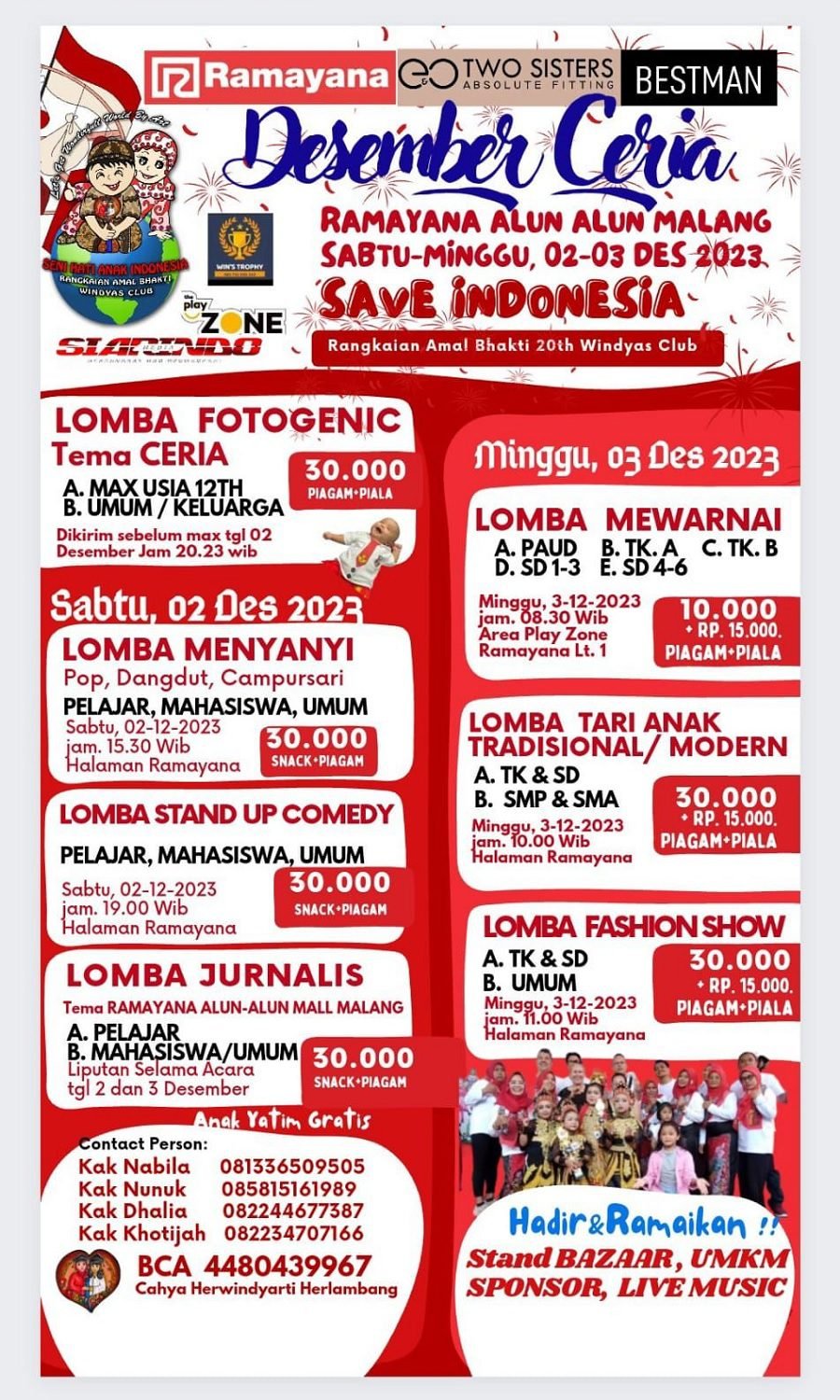 SIARINDOMEDIA.COM – Ramayana Malang Kota bersama Windyas Club dan Siarindo Media kembali mengadakan perlombaan yang bertajuk Desember Ceria. Rencananya event ini akan digelar di halaman Ramayana Kota Malang pada Sabtu dan Minggu (2-3/12/2023) mendatang.