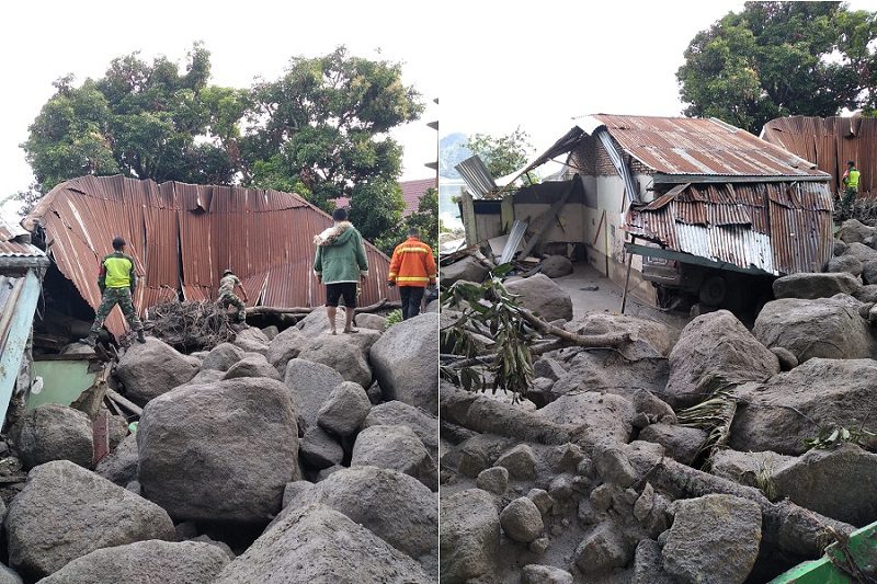 Hal itu kemudian memicu terjadinya banjir bandang yang membawa bongkahan batu berukuran besar dan puing berupa batang pohon serta ranting berikut air bah bercampur lumpur.