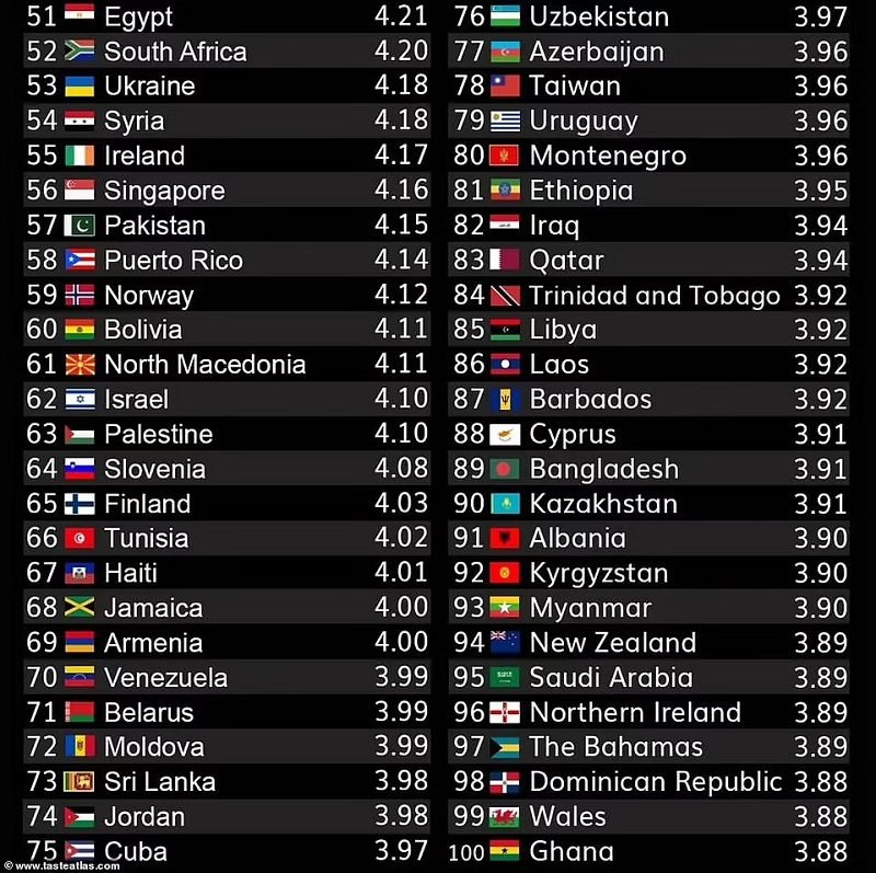 Taste Atlas menyusun kepopuleran serta kelezatan makanan dari berbagai negara berdasarkan resep otentik, bahan-bahan lokal yang dipakai, ulasan kritikus makanan, review tempat (restoran) dan publikasi mengenai makanan-makanan tersebut.