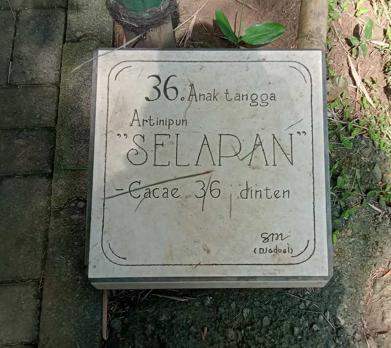 Setiap melewati anak tangga, terdapat tulisan filosofis Jawa seperti 7 anak tangga yang artinya seminggu (dalam 1 minggu terdapat tujuh hari), 36 anak tangga yang artinya selapan (jumlah hari dalam 1 bulan pada kalender Jawa) dan 12 anak tangga ( dalam setahun terdapat 12 bulan).