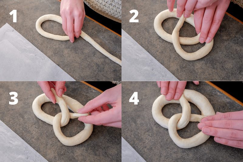 PUTAR & TEKAN. Urut-urutan membentuk pretzel hingga membentuk simpul dari bahan-bahan yang sudah diolah. Foto: recipesfromeurope.com - Didihkan air dalam panci besar. Tambahkan baking soda. Masukkan pretzel ke dalam air mendidih, satu per satu, dan rebus selama 30 detik. Angkat dan tiriskan.