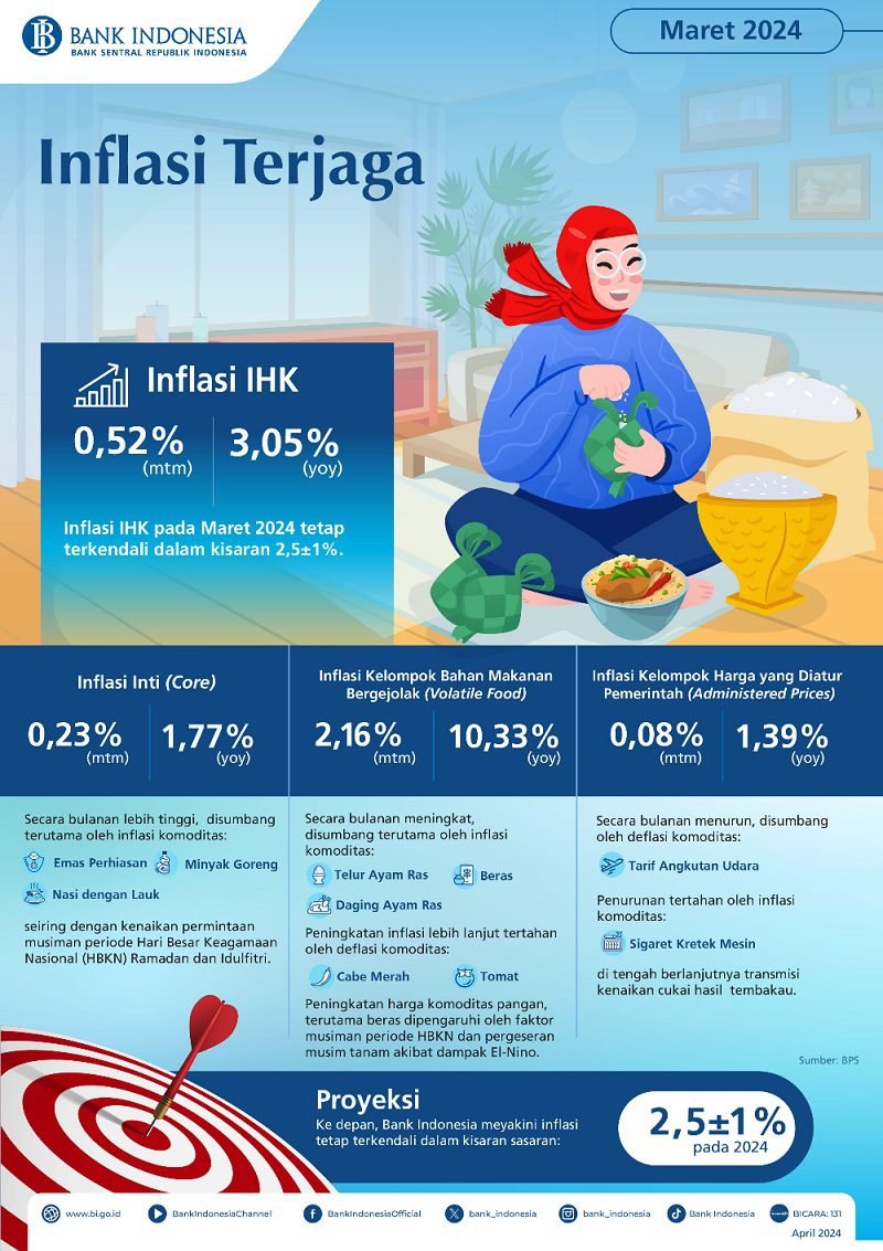 Inflasi Indeks Harga Konsumen (IHK) pada Maret 2024 tetap terjaga dalam kisaran sasaran 2,5±1%.