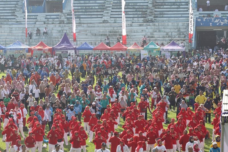 Meski terik matahari menyengat, para hadirin sangat antusias dan semangat mengikuti senam yang digagas Pj Wali Kota Malang, Wahyu Hidayat.