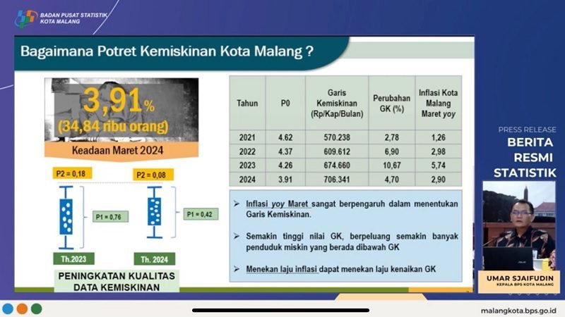 Dalam data tersebut, Kepala BPS Kota Malang, Umar Sjaifudin, M.Si. menyebutkan jumlah penduduk miskin di Kota Malang turun dari 37,78 ribu jiwa pada Maret 2023 menjadi 34,84 ribu jiwa pada Maret 2024.