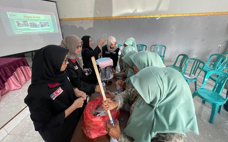 Ibu-ibu PKK dengan sangat antusias mengikuti proses pembuatan Ecobrick dengan memasukkan semua sampah plastik kedalam botol-botol bekas yang telah disediakan, botol-botol yang telah terisi penuh dengan plastik akan dirangkai menjadi meja hias. Selain itu, beberapa anggota ibu-ibu PKK juga belajar merajut dan hasil rajutan tersebut akan digunakan sebagai taplak meja.