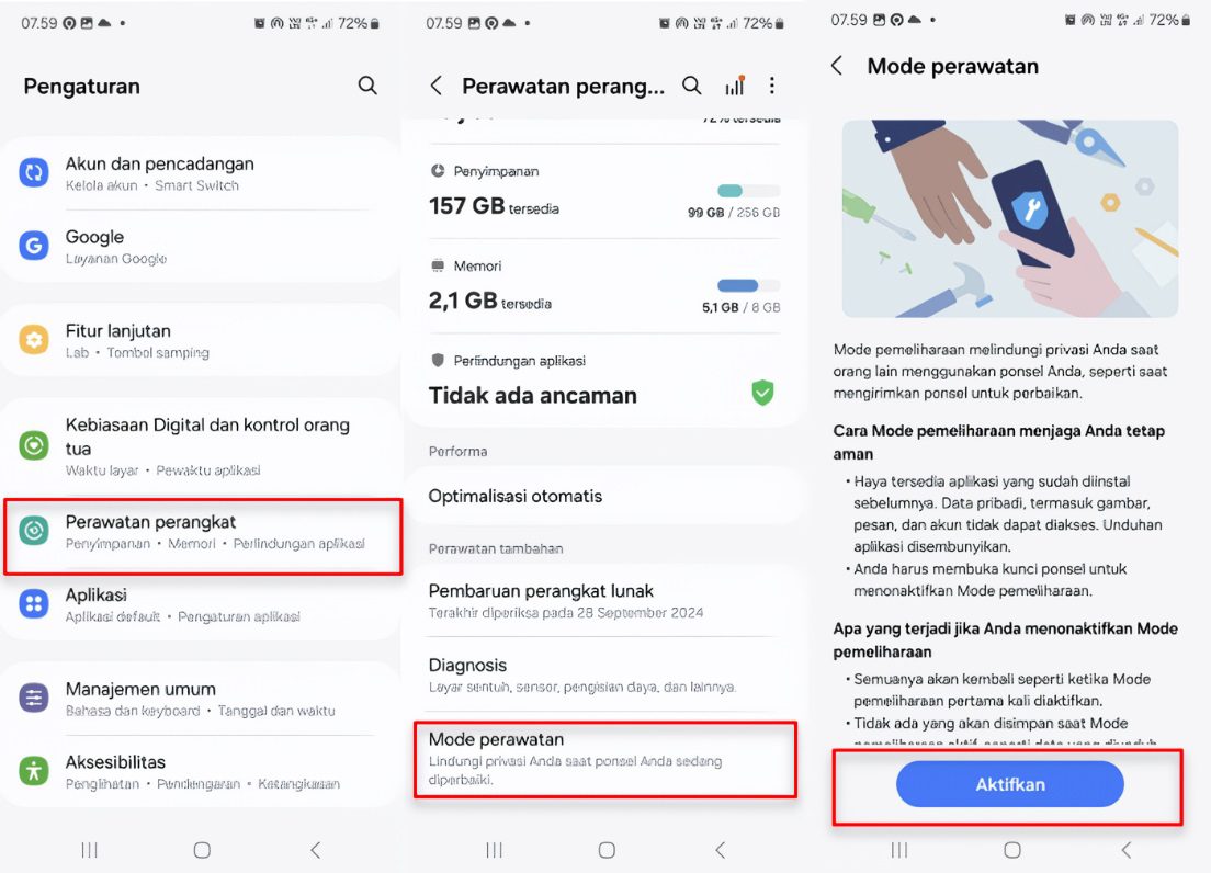 Mode Perawatan dirancang khusus untuk melindungi dan menyembunyikan data pribadi kamu agar tidak dapat diakses oleh petugas Service Center ketika smartphone kamu sedang menjalani perbaikan. Kamu bisa tenang menitipkan smartphone saat diperbaiki.