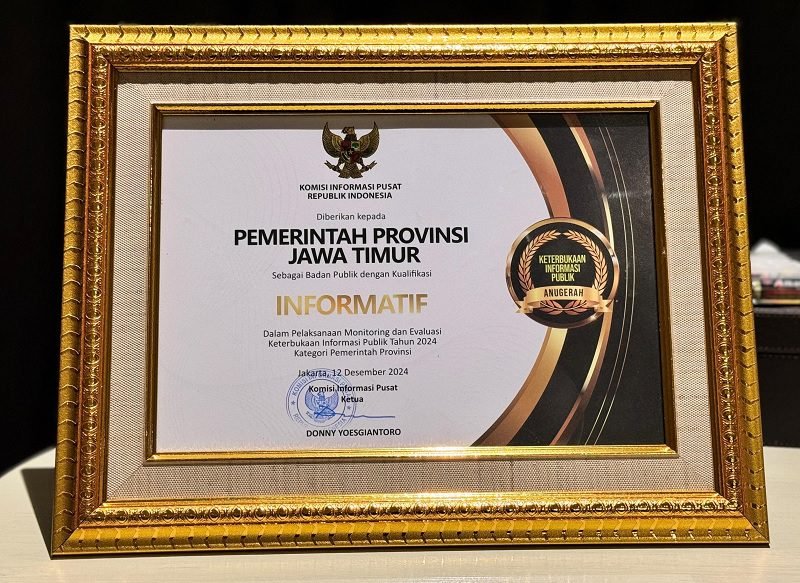 SIARINDOMEDIA.COM – Pemerintah Provinsi (Pemprov) Jatim terus konsisten mempertahankan predikat badan publik Informatif tingkat Provinsi se-Indonesia. Bahkan, pada pengumuman Anugerah Keterbukaan Informasi Publik tahun 2024, capaian skor Jatim melonjak empat poin. Tahun sebelumnya mendapat skor 92,00, tahun ini menjadi 96,94. Artinya, hanya tinggal kisaran tiga poin saja, skornya menjadi sempurna.