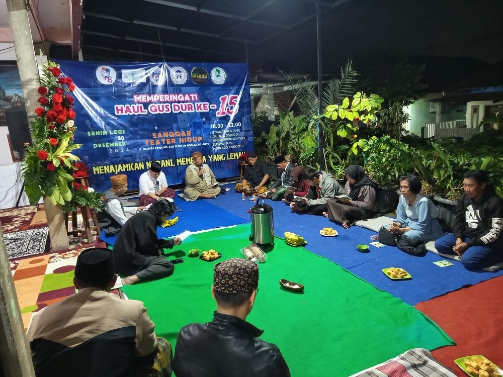 SIARINDOMEDIA.COM – Suasana haru dan khidmat menyelimuti Sanggar Teater Hidup Sidomulyo, Batu, Senin Legi (30/12/2024). Puluhan jamaah dari berbagai komunitas hadir dalam acara peringatan haul ke-15 KH Abdurrahman Wahid (Gus Dur) yang digelar di tempat ini. Acara yang dimulai sejak magrib ini diawali dengan istighotsah dan tahlil bersama, sebagai bentuk penghormatan dan doa untuk almarhum di pimpin Kyai Musyrifin (Pengasuh Padepokan Bumiaji Panatagama).