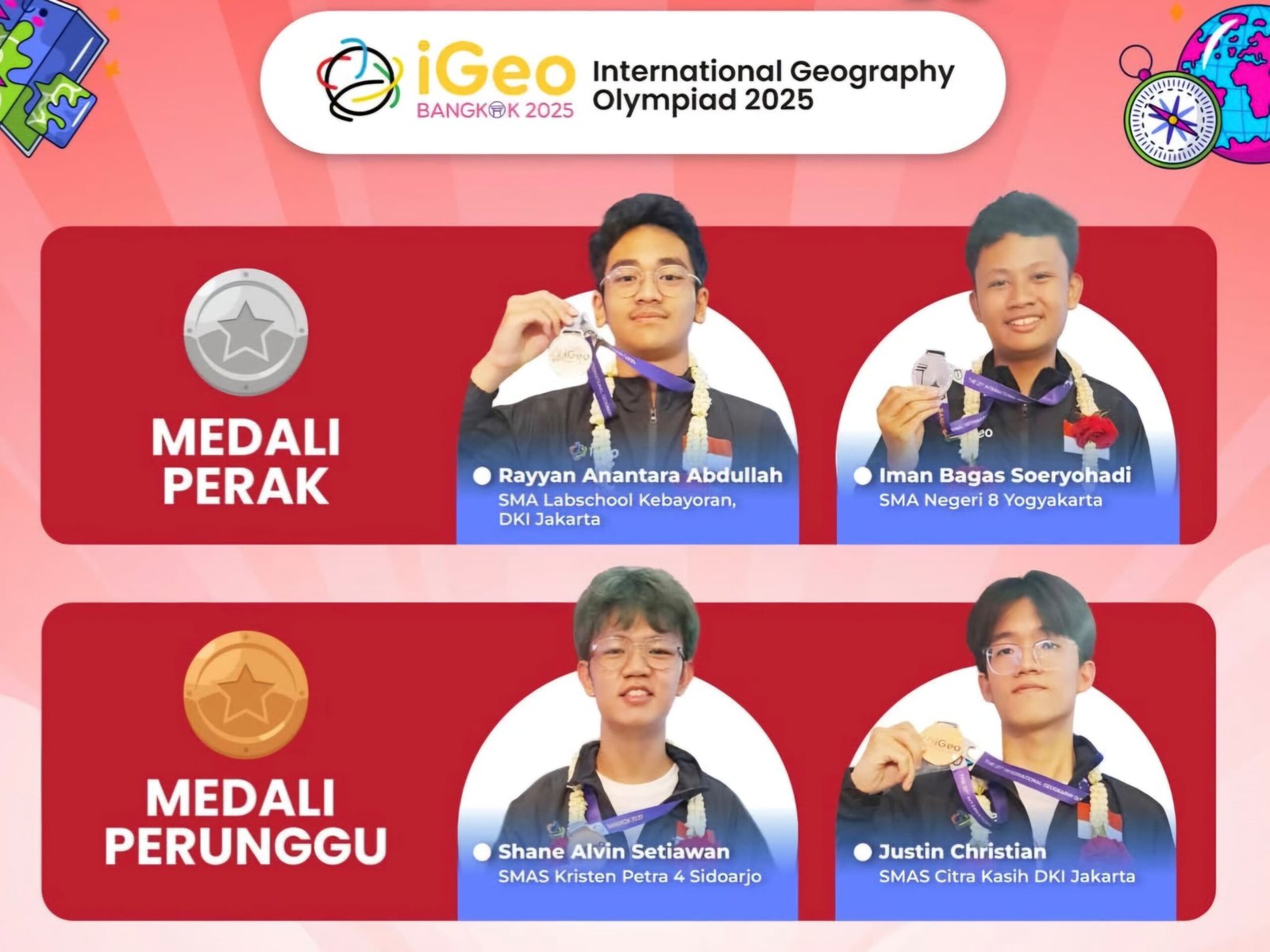 Empat siswa terbaik Indonesia berhasil menorehkan prestasi gemilang dalam ajang International Geography Olympiad (iGeo) ke-21. Kompetisi internasional bergengsi ini diselenggarakan di Bangkok, Thailand, pada 26 Juli hingga 1 Agustus 2025, dan diikuti oleh puluhan negara.